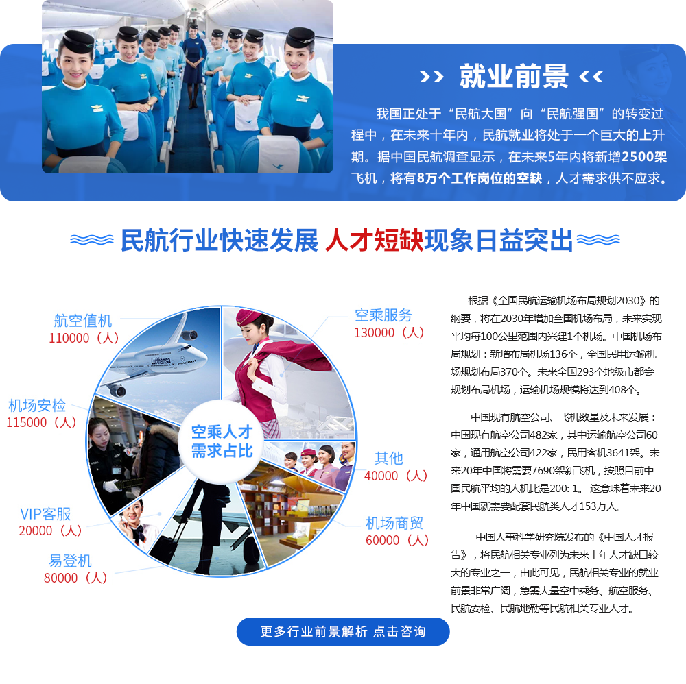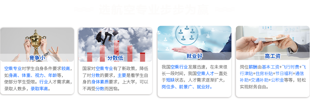 学校优势: 立足高校背景,培养航企文化;专业训练设施完善,定期航空公司实训;与航空企业无缝链接的合作关系,技能学历双丰收